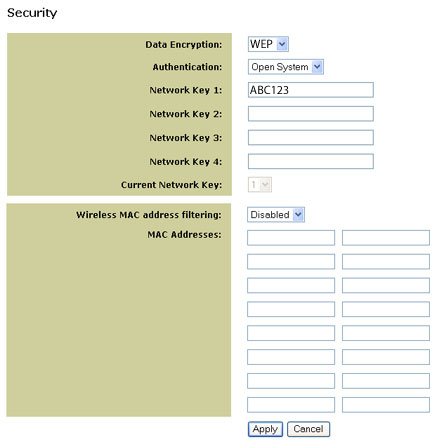 Your 5430 supports 64-bit and 128-bit WEP security. If available on your wireless router, we recommend you enable the higher bit security. When you enable WEP, it uses a key to encrypt the data and this specifically formatted data can only be understood by another wireless device that knows of this key. Since both ends use the same key, any users who do not know the key cannot connect to your network and use your Internet connection.