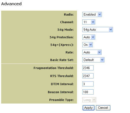 The 802.11g standards provide a protection method so 802.11g and 802.11b devices can co-exist in the same network without “speaking” at the same time. Do not disable 54g Protection if there is a possibility that a 802.11b device may need to use your wireless network. In Auto Mode, the wireless device will use RTS/CTS to improve 802.11g performance in mixed 802.11g/802.11b networks. Turn protection off to maximize 802.11g throughput under most conditions.