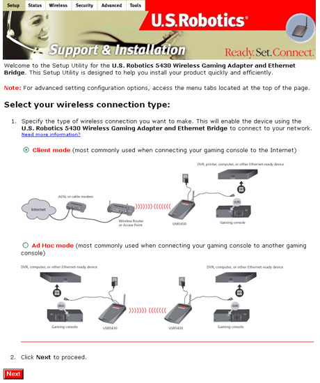 To change between Client and Ad Hoc Modes, simply access the Web User Interface, select Setup, and follow the on-screen instructions as demonstrated in the graphics below: