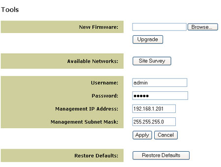 Download and place the firmware file to a local directory. Place the 5430 in Configuration Mode (insert a pin or paperclip to press the reset button momentarily - less than 2 seconds). Connect the Ethernet cable to your computer’s Ethernet port and release and renew your computer’s IP address (refer to the Accessing the 5430’s Web User Interface pages in this User Guide for more information). Launch an Internet browser and enter http://192.168.1.201 in the address line. Enter the username (the default username is admin) and the password (the default password is admin) to access the Web User Interface. Select the Tools tab. From the New Firmware line, select Browse and locate where the downloaded firmware file was placed. Select Upgrade to start the upgrade. It is important that you do not unplug the cable or interrupt the upgrade. Allow several minutes for the adapter to reboot after the upgrade.