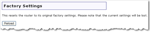 Click Reload to restore the factory default settings of your router. When you restore the factory default, all your current settings will be lost. If you have forgotten the password to your router, you will need to restore to the factory default using the Reset button on the router, and then reinstall your router.