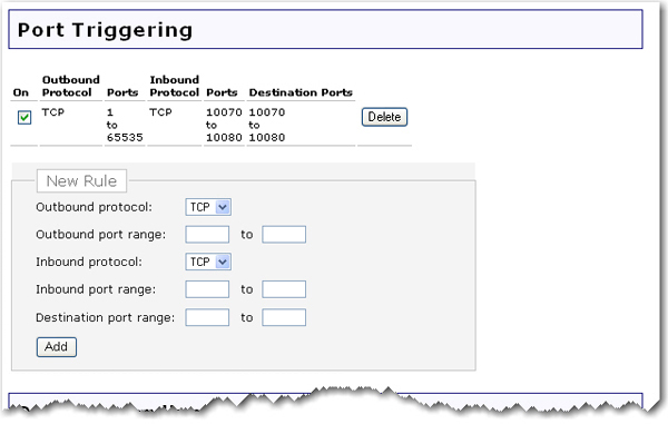 Specify the Destination port range for the ports the inbound connection will be translated to. When this Port Trigger is active, the router will translate the destination port of an inbound connection to this port range.