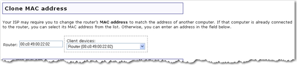If your ISP requires a specific MAC address for the Internet connection, you will need to change the MAC address of the router. Either select the MAC address from the
