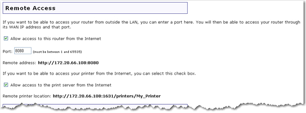 Remote Access allows any host on the entire WAN network to connect to the router's configuration pages. By default, only devices that are connected to the router via an Ethernet cable at a LAN port can access the router's configuration pages. To enable Remote Access, select Allow access to this router from the Internet. By default, the port "8080" is assigned. If you wish to use another port, enter the port number.