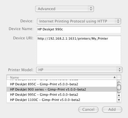Note: The Device URI information is case-sensitive and must be entered exactly as it is listed on the Printer location section on the router's Status page. If you have modified the IP address of your router, then use your router's IP address in place of 192.168.2.1.