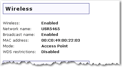 Broadcast name: Displays whether the broadcasting of the network name is Enabled or Disabled. This can be configured from the Wireless page.