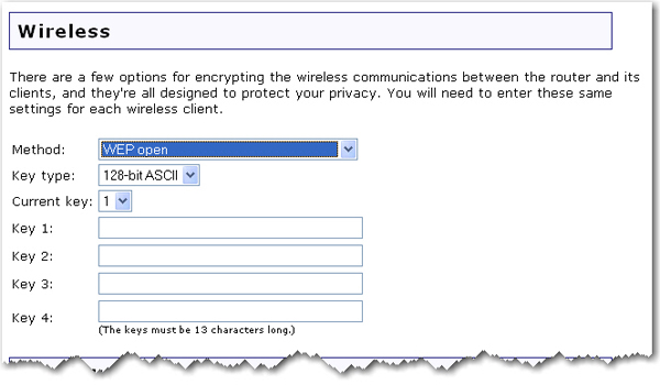 Under Wireless, select your security Method and enter the appropriate wireless security information information in the corresponding fields.