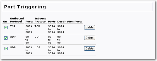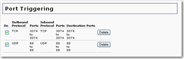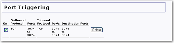 The router comes with a default Port Triggering rule that you will need if you are connecting a Sony Playstation2™ that needs to access the Internet to your router. To enable the rule, select the On checkbox for the rule. This page also details how you could create your own PlayStation2™ Port Triggering rule.