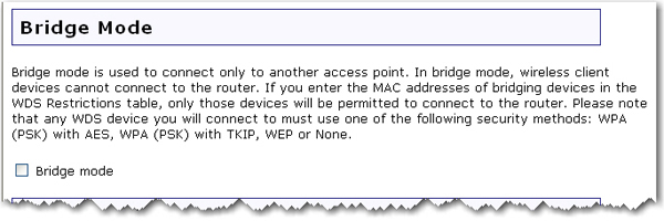 If you enable Bridge mode and WDS Restrictions in the wireless router, a bridge will be created to another wireless router or access point and no wireless clients will be able to connect to the wireless network. This is generally used when you want to connect two networks that are in different buildings. Each wireless router or access point will have to have the MAC address of the other device entered in the WDS Restrictions table.
