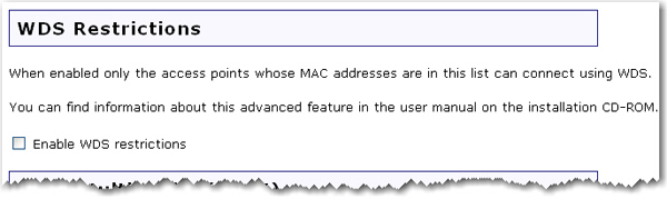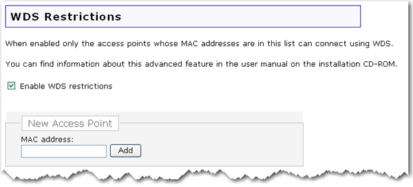 If you select Enable WDS restrictions, you will need to enter the MAC addresses of the wireless routers or access points that will connect to this router and click the Add button.