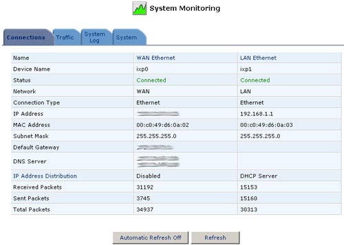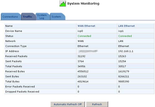 TrafficThe USR8200 Firewall/VPN/NAS is constantly monitoring traffic within the local network and between the local network and the Internet. You can view up-to-the-second statistical information about data received from and transmitted to the Internet (WAN) and about data received from and transmitted to computers in the local network (LAN).