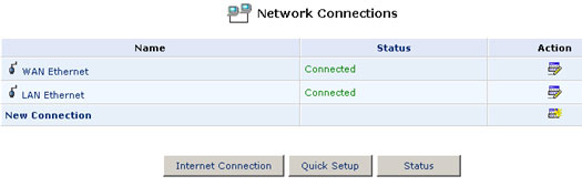 To access the Connection Wizard, click the Network Connections icon on the side bar. The Network Connections screen will appear, listing all current connections. On the Network Connections screen, you can create, view, or modify the network connections of the USR8200 Firewall/VPN/NAS. Within this area, you can create or modify four types of network connections: