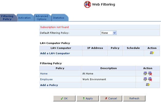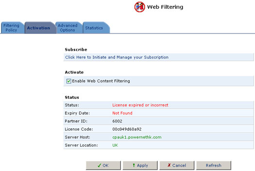 Activating the Filtering Service1. Click the Web-Filtering icon on the sidebar. If you haven't subscribed yet or your subscription has expired, the Activation page is displayed. Otherwise, click the Activation tab. 2. If the Enable Web Content Filtering checkbox in the Activate section is not selected, select it and click Apply. The Subscribe and Status sections will then be displayed.
