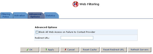 Filtering OptionsIn order to decide whether to allow or block a specific site, the filter service provider is consulted about the site's category. In case an error occurs consulting the provider, you can decide whether to block or allow access to all sites. 1. Click the Web-Filtering icon on the sidebar. 2. Click the Advanced Options tab.