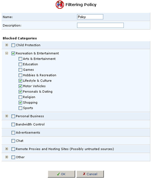 4. Type in a name for the new policy in the Policy Name field. 5. Type in a description of the new policy in the Description field. 6. Select the content filtering check boxes that represent content that you wish to block. 7. Click OK.