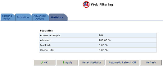 To view content filtering statistics, perform the following: 1. Click the Web-Filtering icon on the sidebar. 2. Click the Statistics tab.