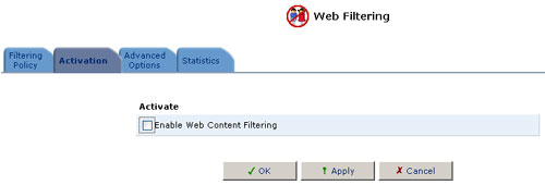 To enable or disable the USR8200 Firewall/VPN/NAS's web-content filtering, perform the following steps: 1. Click the Web-Filtering icon on the sidebar. 2. Click the Activation tab. 3. Select the Enable Web Content Filtering check box. 4. Click OK.