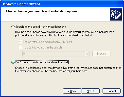 4. In the Please choose your search and installation options window, select Don't search. I will choose the driver to install and click Next.
