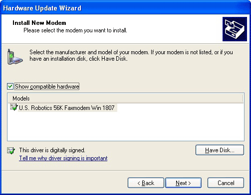 5. Windows will show you the current driver that is installed for the modem. Click Have Disk.
